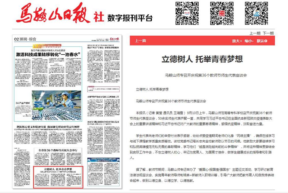 【马鞍山日报】马鞍山师专召开庆祝第36个教师节师生代表座谈会