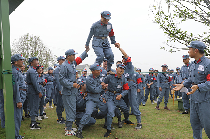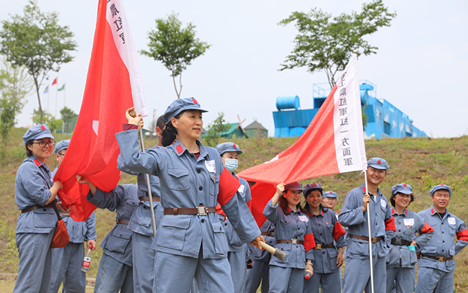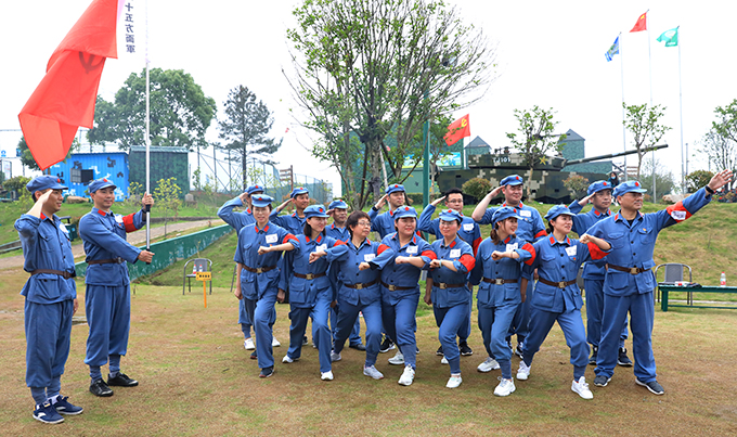 大家首站体验红军从“瑞金”出发场景,党员们在教练的讲解下,了解“红军井”来历,在“红军不怕远征难,万水千山只等闲”的豪言壮句中,依次拿起碗杯,喝下壮行酒。在“湘江”,党员们体验了红军湘江战役中突围场景。随后,大家来到遵义会议场景举行了授旗仪式,成立红一方面军、红二方面军、红四方面军、红二十五方面军,并由选出的“军长”“政委”,设计团队口号。确立纵队后,大家听从教练的指导,通过互帮互助依次传递泡沫板,顺利完成了“四渡赤水”。在模拟红军“强渡大渡河”“飞夺泸定桥”的场景中,全体党员克服恐惧,有条不紊的通过索道,通过本次项目。临近午时,为了还原红军“懋功会师场景”,大家品尝忆苦思甜饭,以粗简的饭菜更好的理解长征路上红军不畏艰苦的精神。午饭后,大家马不停蹄的回到基地,用两人合作通过指压板的形式,感受红军过草地的艰难。在腊子口,大家分组对抗,速射起倒靶,亲自感受激战情景。本次活动先后经过“瑞金”“血战湘江”“遵义会议”等长征路线中多个具有革命意义的事件或地点,以此模拟“重走长征路”。