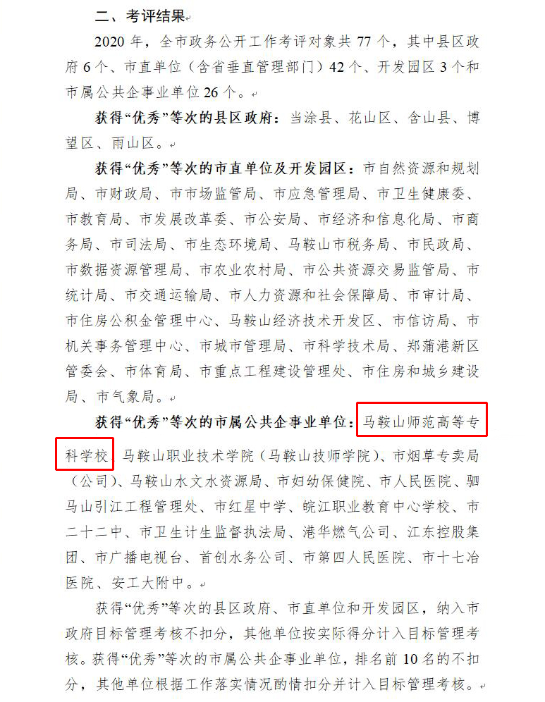 日前,马鞍山市人民政府办公室公布《关于2020年全市政务公开工作考评情况的通报》,2020年,全市政务公开工作考评对象共77个,其中县区政府6个、市直单位(含省垂直管理部门)42个、开发园区3个和市属公共企事业单位26个。开云kaiyun登录入口在市属公共企事业单位中获得“优秀”等次。
