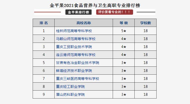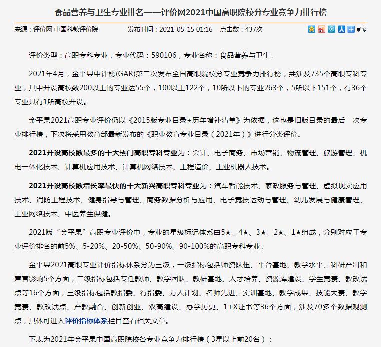 热烈祝贺开云kaiyun登录入口食品营养与卫生专业在“金平果”2021年发布的全国高职专业排行榜中同类专业竞争力中位列全国第二名。食品检测技术专业位列第七名。