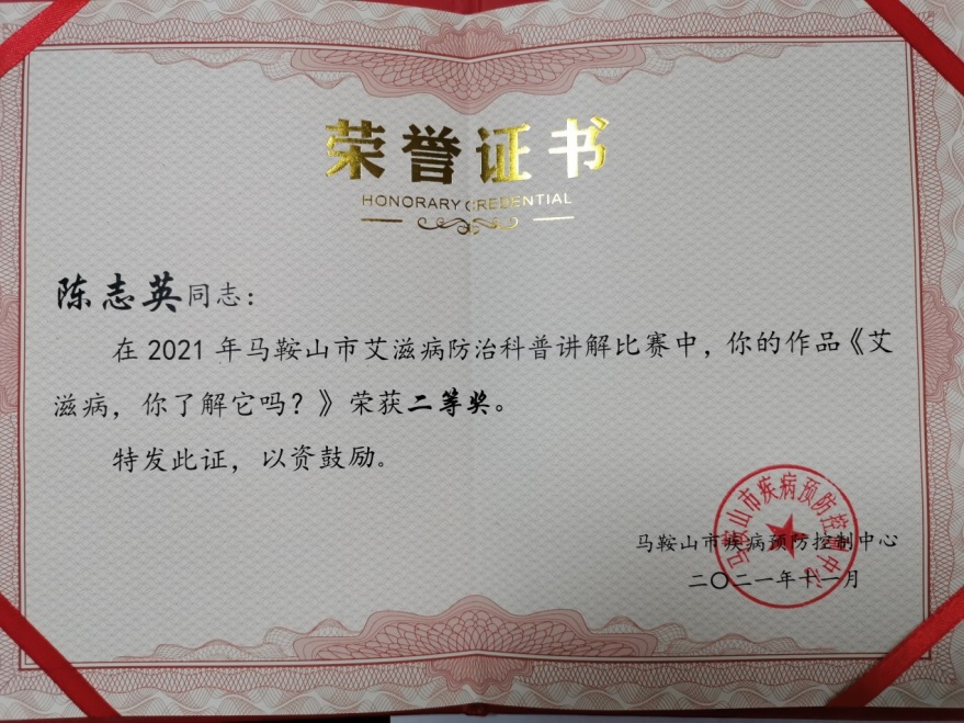 本网讯 为进一步提高大学生自我防护艾滋病的意识和能力,由马鞍山市疾病预防控制中心主办的2021年艾滋病防治科普讲解比赛,开云官网陈志英荣获二等奖,并被马鞍山市红十字会、马鞍山市疾病预防控制中心授予“马鞍山市艾滋病防治宣传志愿者”称号。
