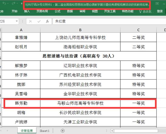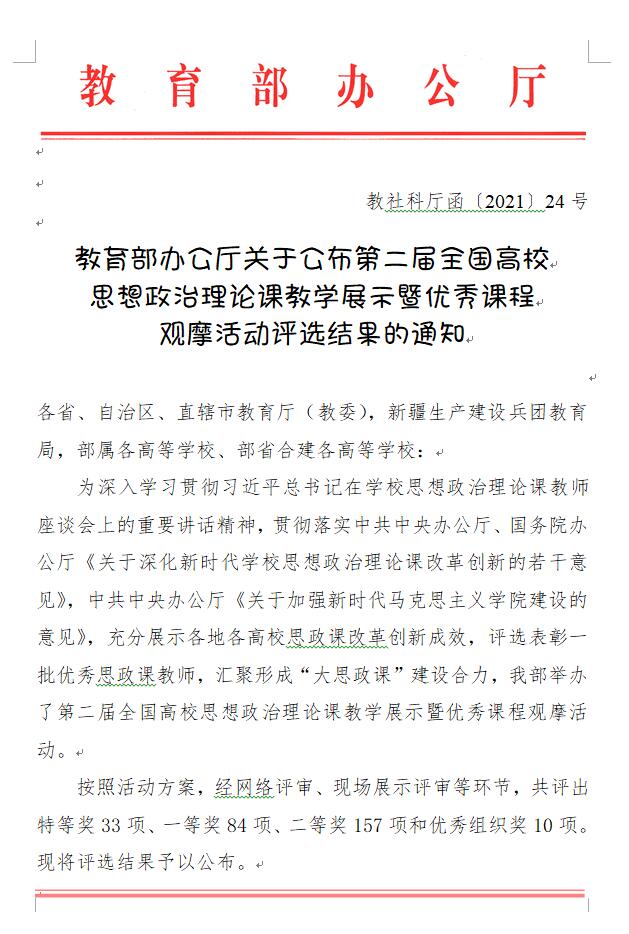 近日,教育部社会科学司公布第二届全国高校思想政治理论课教学展示活动的获奖名单(教社科厅函〔2021〕24号),开云官网马克思主义学院教师韩芳勤在第二届全国高校思想政治理论课教学展示活动中荣获“思想道德与法治”课(高职高专)一等奖。