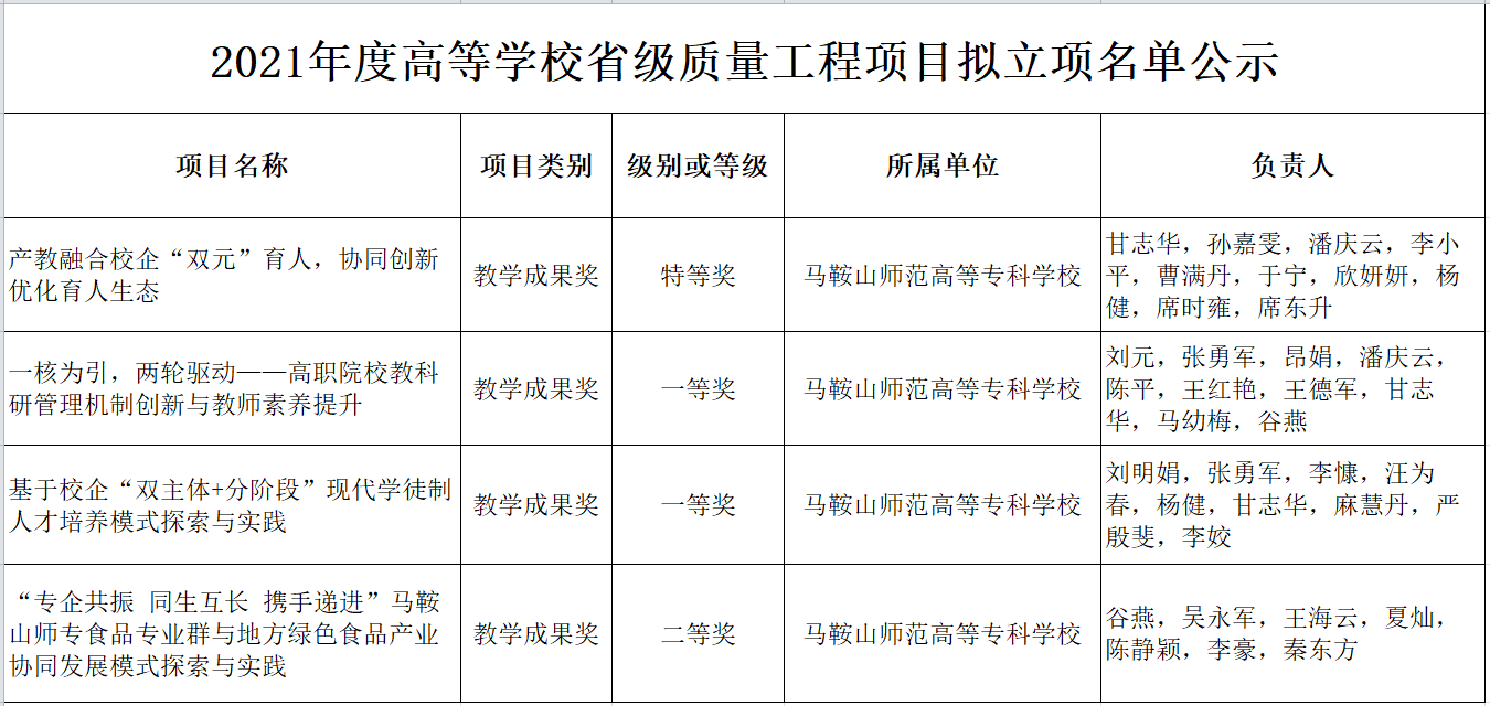 日前,安徽省教育厅公布了2021年度高等学校省级质量工程项目立项名单,开云kaiyun登录入口共获批12个大类40个项目。其中教学成果奖类取得新突破,获批省级教学成果奖4项,其中特等奖1项,一等奖2项,二等奖1项。(文/昂娟 编辑/王鑫 黄凌骜 审核/刘元)