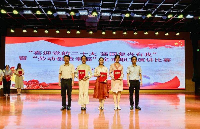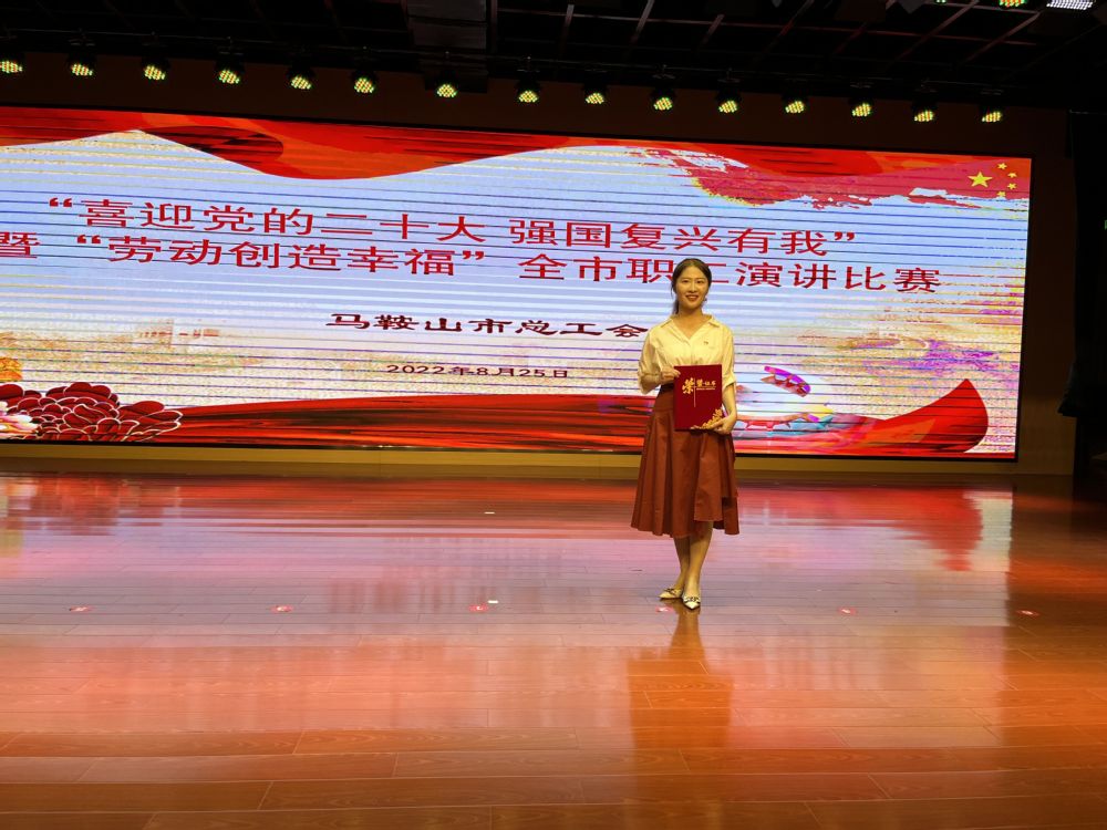热烈祝贺开云kaiyun登录入口滨江校区万丽文老师代表学校在马鞍山市总工会举办的“喜迎党的二十大 强国复兴有我”暨“劳动创造幸福”全市职工主题演讲比赛中荣获三等奖,此次比赛汇集全市各行各业的精英,共计参赛选手35人,万丽文总分排名第五,获三等奖。