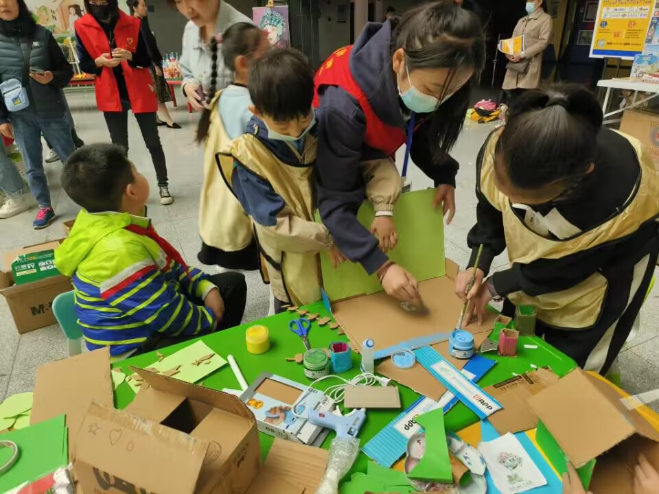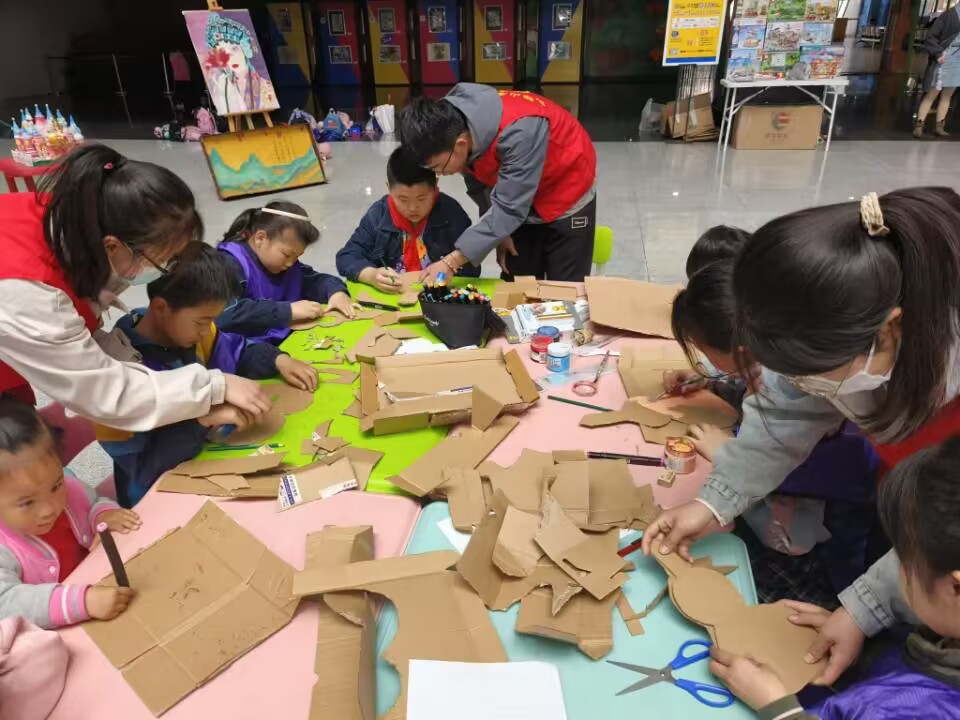 讲解过后,青年志愿者们带领小朋友们用废纸盒、旧麻绳等材料一起制作“环保之家”“通向未来的火车”“诗城乐器”三组环保作品。在青年志愿者们的耐心指导下,小朋友们挥动巧手,开动脑筋,专心致志地沉浸在作品创作中,现场气氛热烈而温馨,创意爆棚,大家用天马行空的想象力搭建心中的环保世界。