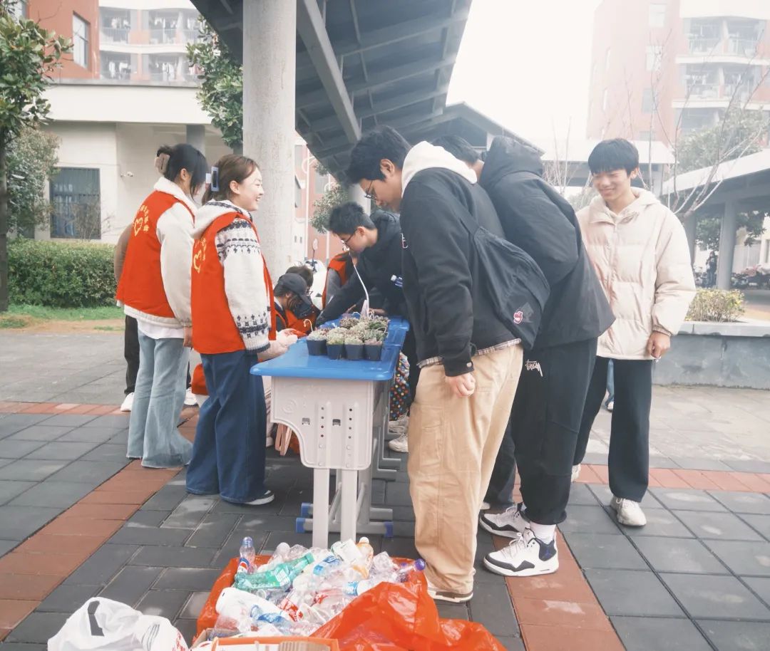 与此同时,滨江校区同样掀起绿色热潮。阳光下,摆放齐整的旧瓶熠熠生辉,形态各异的多肉植物尽显生机,吸引同学们纷至沓来,青春脸庞上写满兴奋与好奇,大家热烈交流着内心的憧憬,志愿者们则热情引导、悉心分享种植窍门,欢声笑语与暖暖爱意交织回荡,让校园处处流淌生机。