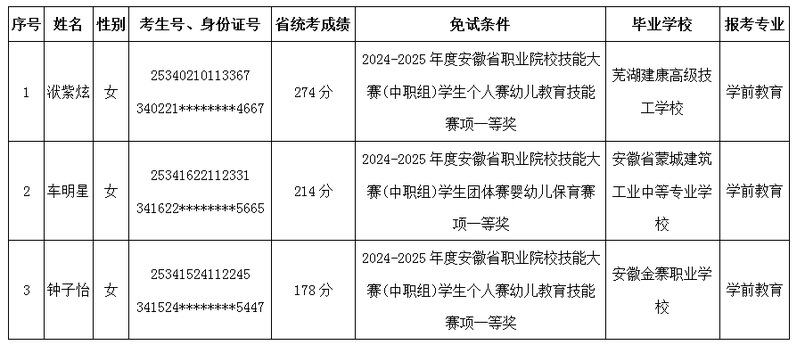 根据有关文件精神和开云官网2025年分类考试招生章程有关规定,报考开云官网与获奖赛项相同或相近专业且文化素质测试合格的考生可免试录取。经过个人申请、资格审核,现将开云官网2025年分类考试招生面向中职生免试录取情况公示如下。如有异议,请拨打招生办电话0555-8215015或学校监察审计处电话0555-8215236。公示时间:2025年3月19日—3月21日。
