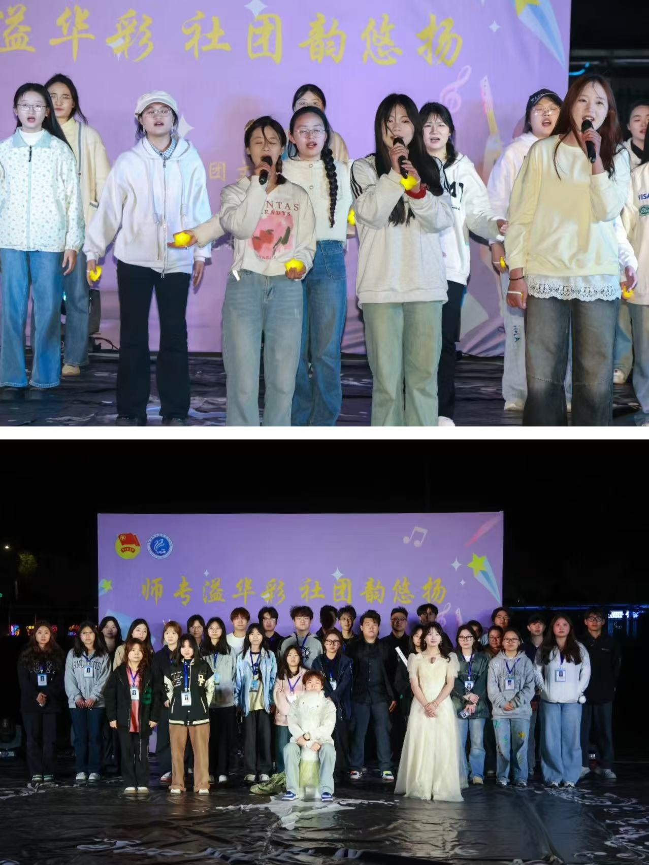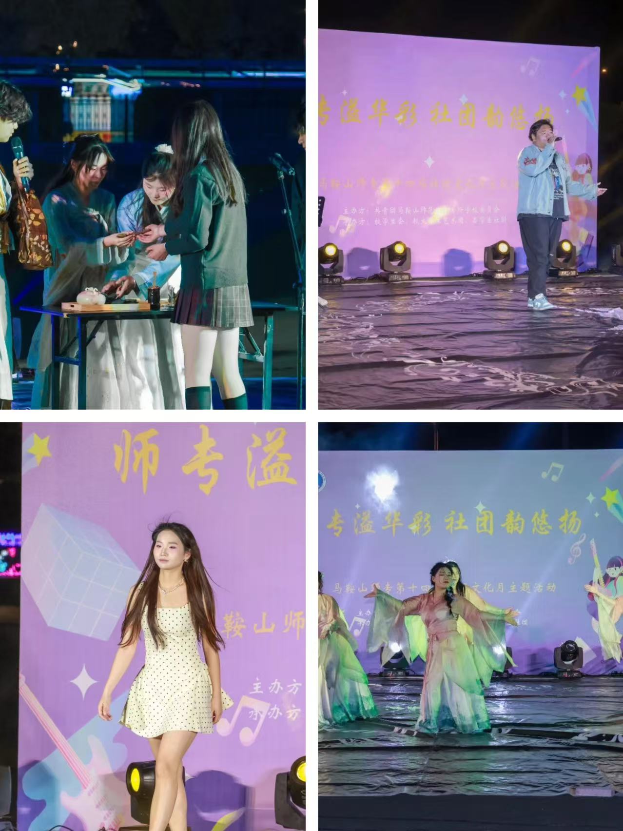 夜幕降临,社团文化月开幕式——节目汇演在操场热烈开场。舞台灯光璀璨,音乐悠扬。校学生会动感舞蹈开场,瞬间炒热气氛;话剧社联合翠螺茶艺社、棋友之家带来《茶香千年》,讲述茶文化,穿插茶诗问答互动;书友会身着古装朗诵《何以华夏,何以中华》,激昂颂文化;模特协会 T 台秀《Gimme more》自信吸睛,互动添趣;大学生艺术团古典舞《似锦》舞姿优美,古韵十足;飞 young 俱乐部与爱心桥梁社合唱《小美满》手捧星光,温馨满满;轮滑社《轮上轻舞》炫技收尾,惊艳全场。