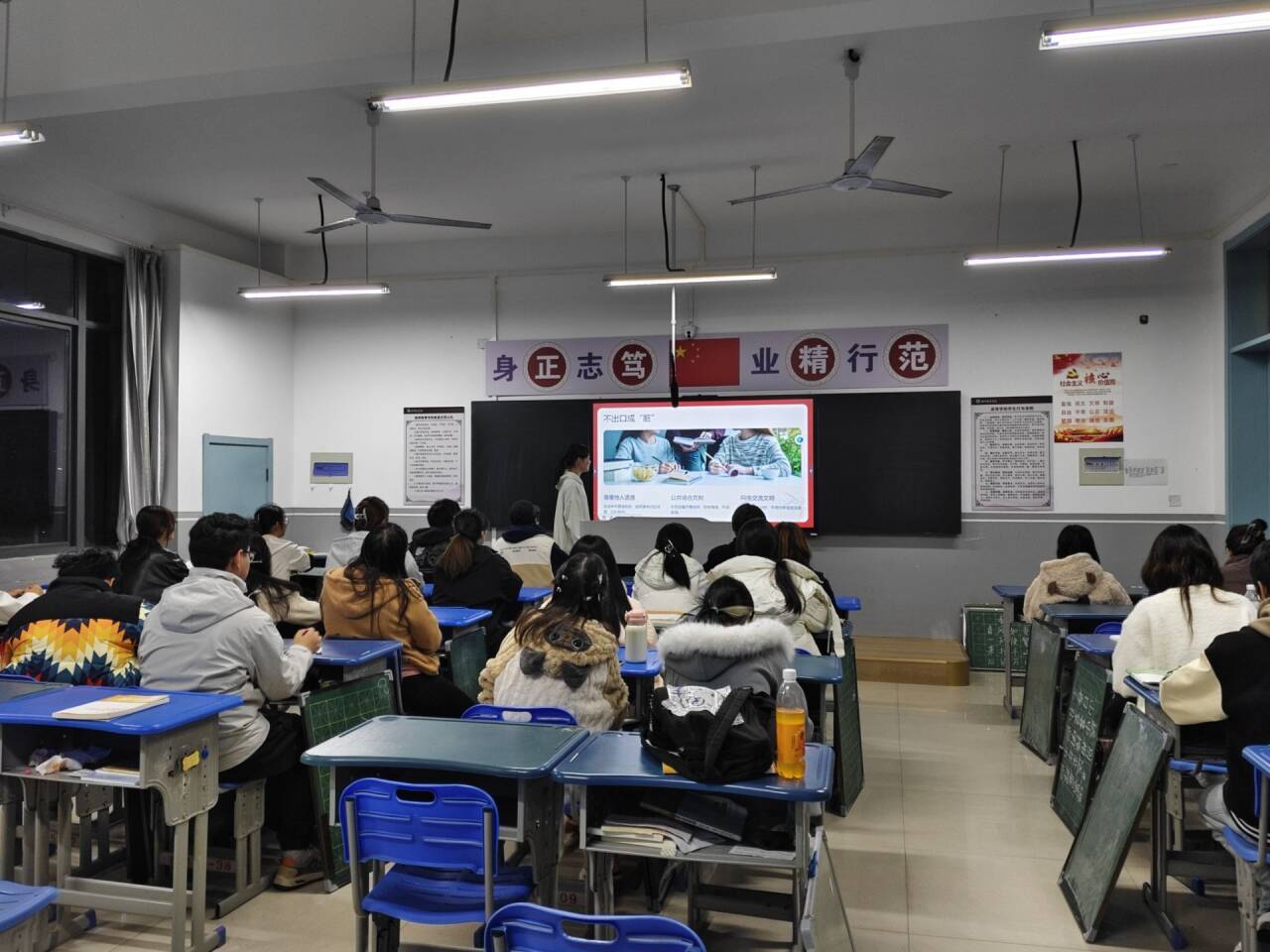 在主题班会上,24级现代教育班负责人通过 PPT 的进行宣讲,以数据展示吸烟对健康的严重危害,如吸烟人群患肺癌概率比不吸烟者高出数倍,直观呈现吸烟风险;接着展示校园内吸烟留下的烟头、弥漫烟味的角落等不文明现象照片,引发同学们对校园环境的关注。其次,24级小学数学教育班的负责人,描述到在文明习惯养成方面,讲述文明行为标准,如遵守校园秩序、使用礼貌用语等,并配生动漫画,便于同学们理解接受。主题班会还设置互动环节,让同学们分享身边吸烟危害案例和文明行为故事。