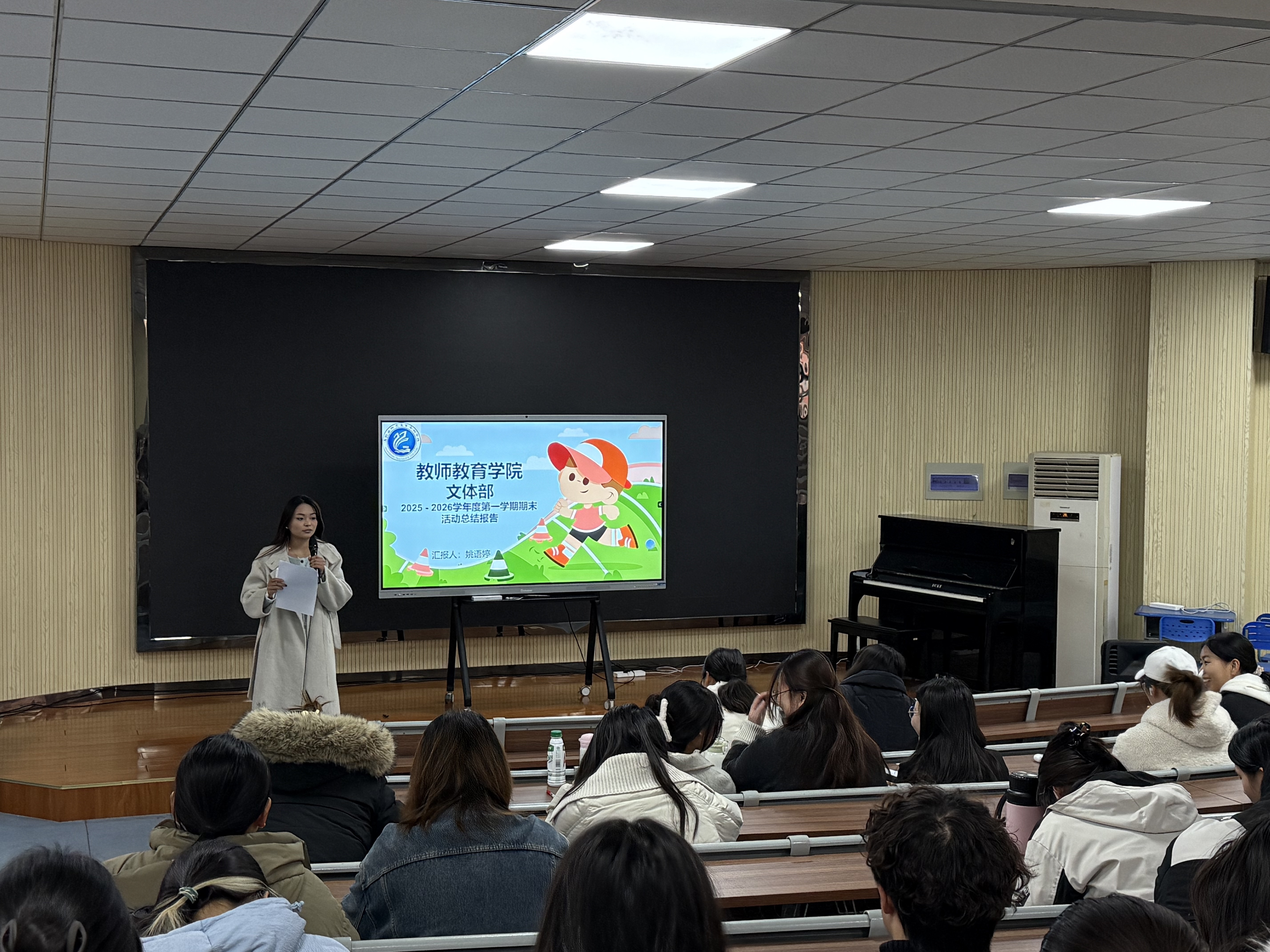会上,各班级学生干部与学生会各部门部长依次进行总结汇报。在各班级学生干部总结环节,25级小学数学教育班团支书借助详实的数据和具体的案例,从班级学风建设、团日活动开展、同学日常服务等维度对学期工作展开汇报。清晰地梳理了班级在课堂考勤管理、学习互助小组搭建等方面所取得的成效,同时也分析了班级活动参与度不均衡等问题,为其他班级的建设与发展提供了工作借鉴。