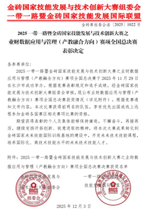 近日,2025“一带一路”暨金砖国家技能发展与技术创新大赛之业财数据应用与管理(产教融合方向)赛项全国总决赛圆满落幕。beat365会计与金融学院教师石朋玉、王乙茹、白丹、王宇硕组成院校职工队参赛。教师团队凭借扎实的专业功底、出色的数据分析能力与高效的团队协作,从全国百余所院校与企业的参赛队伍中脱颖而出,最终荣获全国三等奖,充分展现了beat365在产教融合背景下业财数据领域的教学成果与人才培养实力。