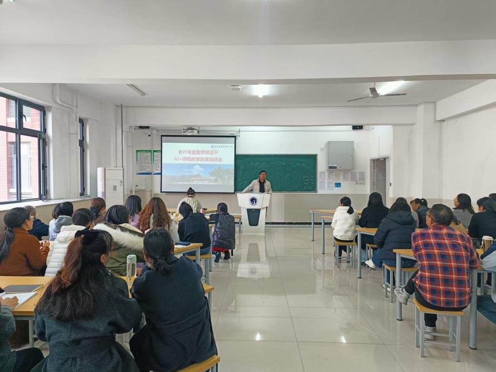 为响应教育数字化转型号召,推动人工智能技术与会计教学深度融合,破解传统财会教学中实操场景有限、数据处理效率低等痛点,提升教师运用 AI 工具优化课程设计、强化实践教学的能力,11月5日下午,会计与金融学院隆重召开 “AI + 课程教学改革师资培训会”。学院全体专任教师共70余人参加培训,共同探索 AI 时代财会专业教育创新发展的新方向。   本次培训会紧扣 AI 赋能财会专业、革新教学模式、提升育人质量” 三大核心,结合会计与金融学科特色,确保培训内容既契合前沿教育理念,又贴合财会教学实际需求。