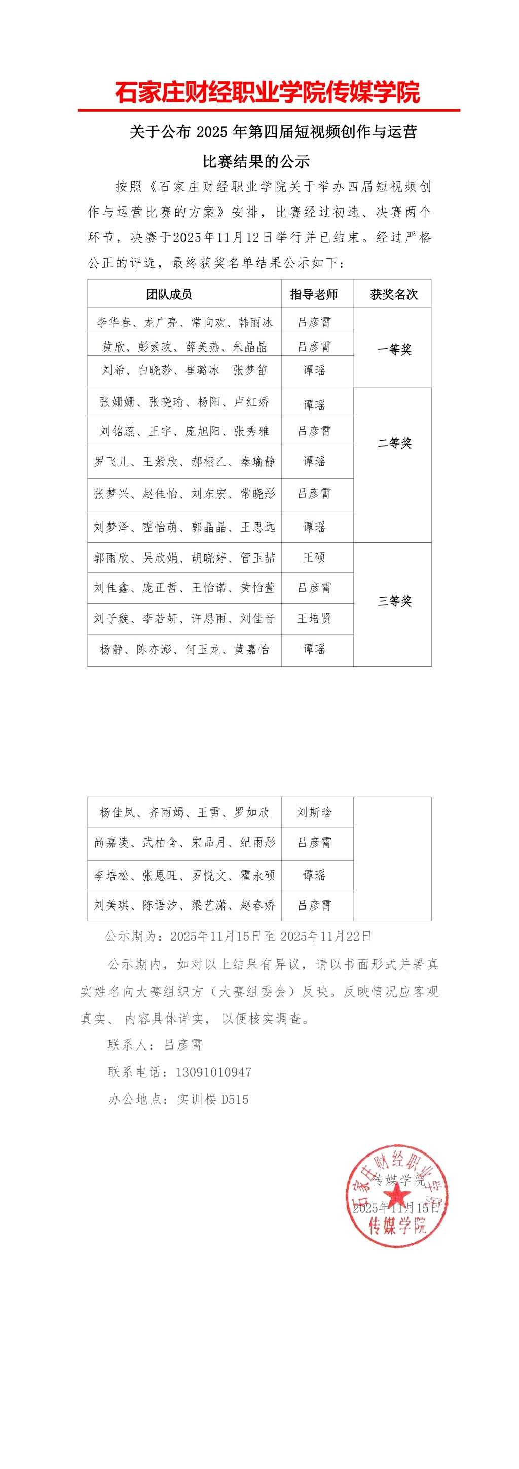 关于公布2025年第四届短视频创作与运营比赛结果公示