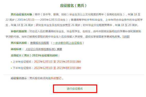 在这个页面中,会告知报名时间以及参军政策说明,建议大家认真阅读后,点击“进行应征报名”,迈出你军旅生涯的第一步!