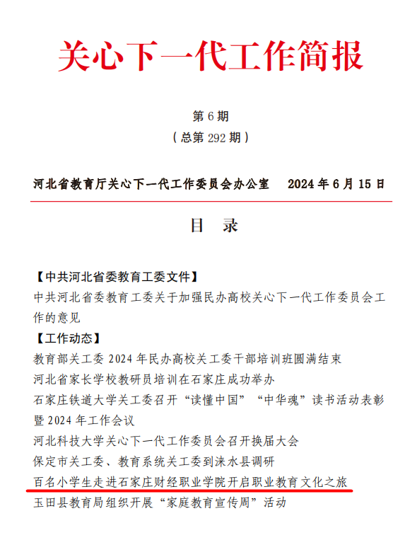 2024年6月,beat365《百名小学生走进英国beat365官方网站开启职业教育文化之旅》一文入选河北省教育厅关心下一代第6期工作简报。