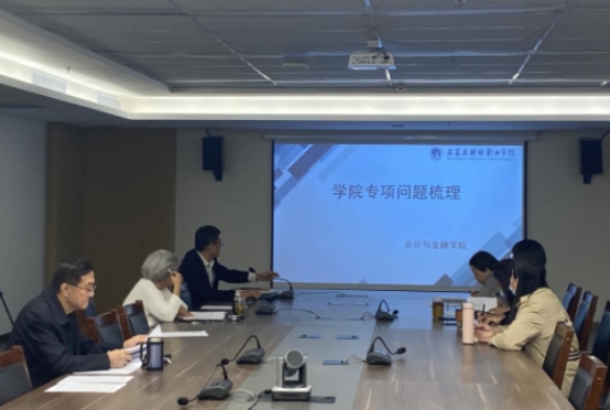 会议前,教务处牵头对会计与金融学院负责的七个省级项目进行建设情况梳理,包含大数据与会计高水平专业群、精品在线开放课《财务管理》、大数据与会计省级教师教学创新团队、数智商科示范性虚拟仿真实训基地、“数智化”教师企业实践流动站和“双师”名师工作室。会上,会计与金融学院院长史耀雄逐一分析了七个项目目前建设情况和存在的问题,并且从师资、学生、设施、设备等方面提出了初步解决方案。其中,参照“创新发展行动计划”的高水平专业群建设绩效评价采集要点,汇报了大数据与会计高水平专业群的建设情况。在汇报过程中,与会的校领导对每个项目逐一进行讨论、给予具体指导,建议对于涉及共性问题要进一步组织专项研究。