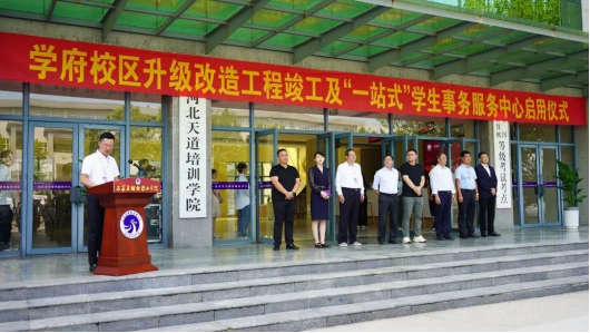 9月13日,学府校区召开了2023年升级改造项目竣工及“一站式”学生事务服务中心启用仪式,董事长肖瀚、校长赵建华教授、党委书记薛向东、副校长葛伟、王永利、李同鑫、校长助理赵振新出席,校区全体中层干部、教职工代表、学生代表参加了仪式。活动由校区综合办公室主任石光主持。