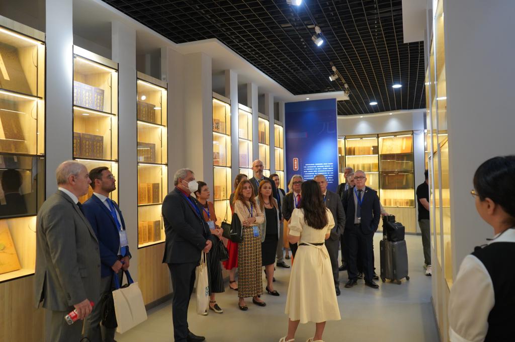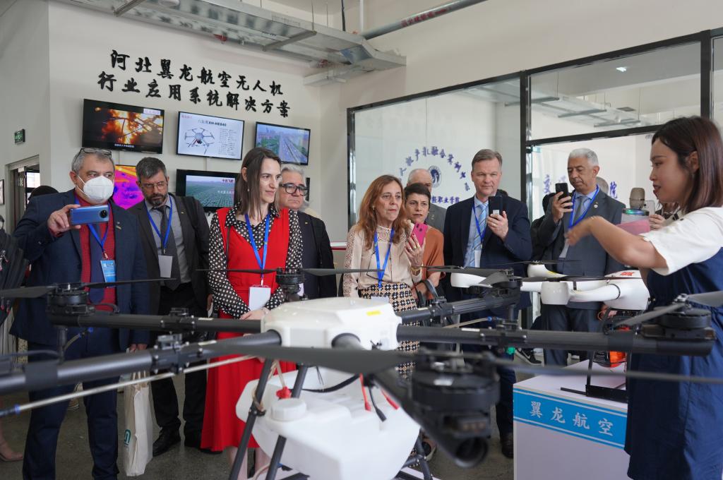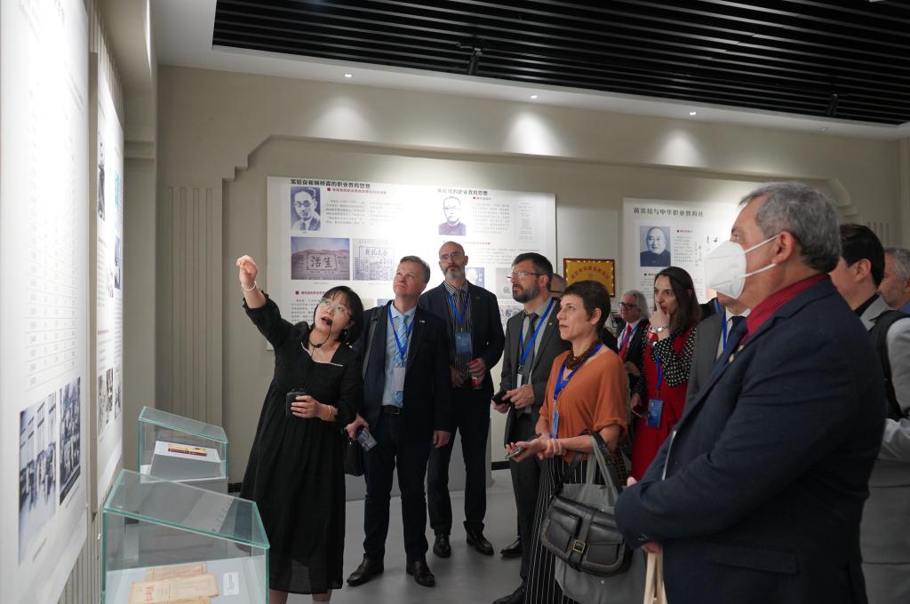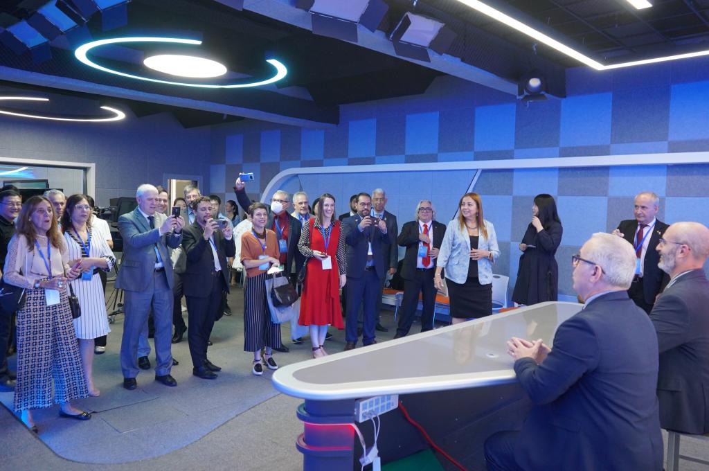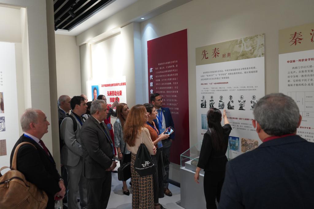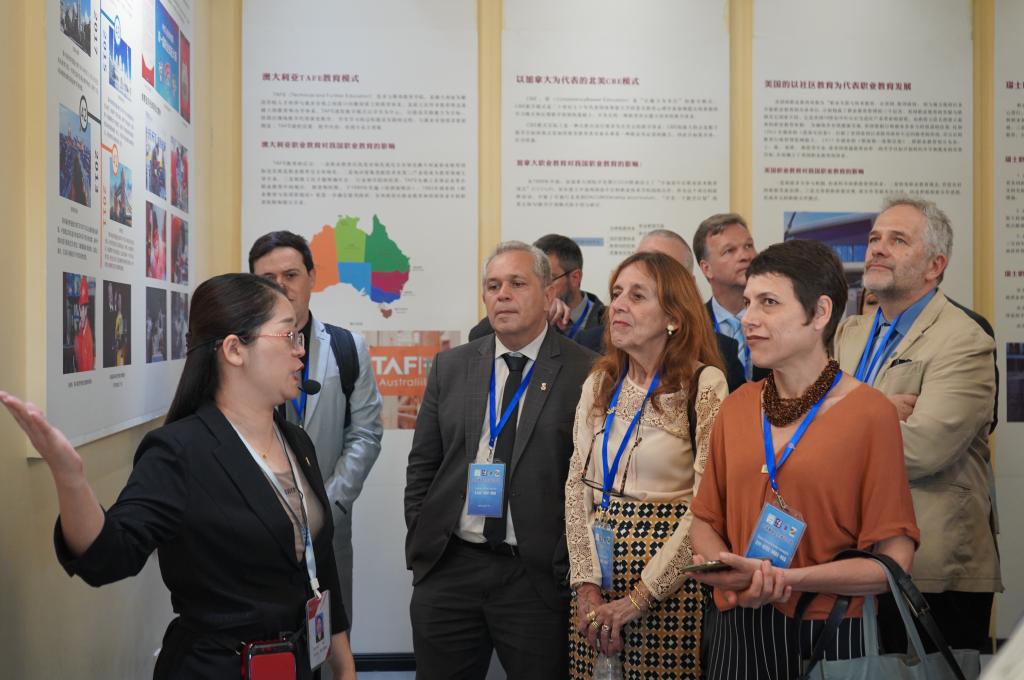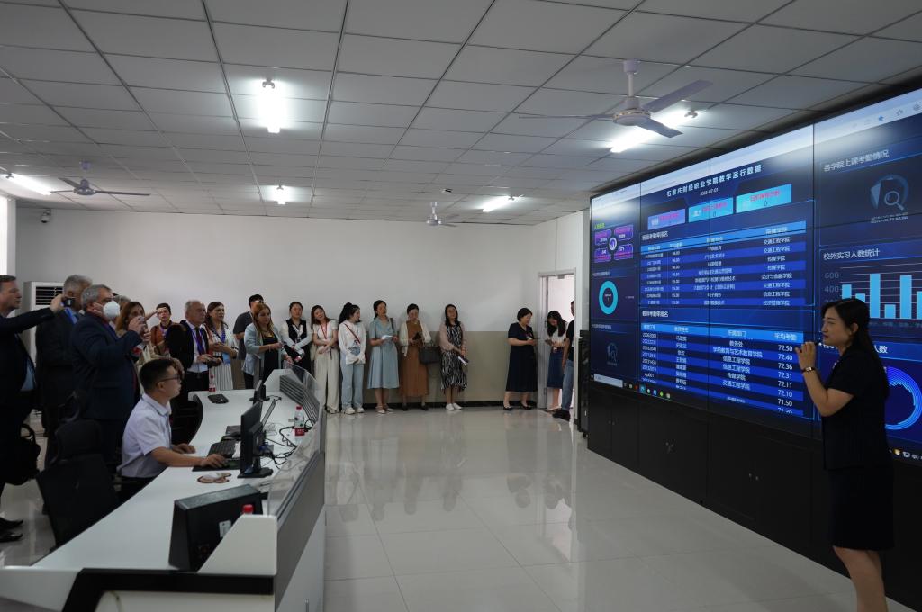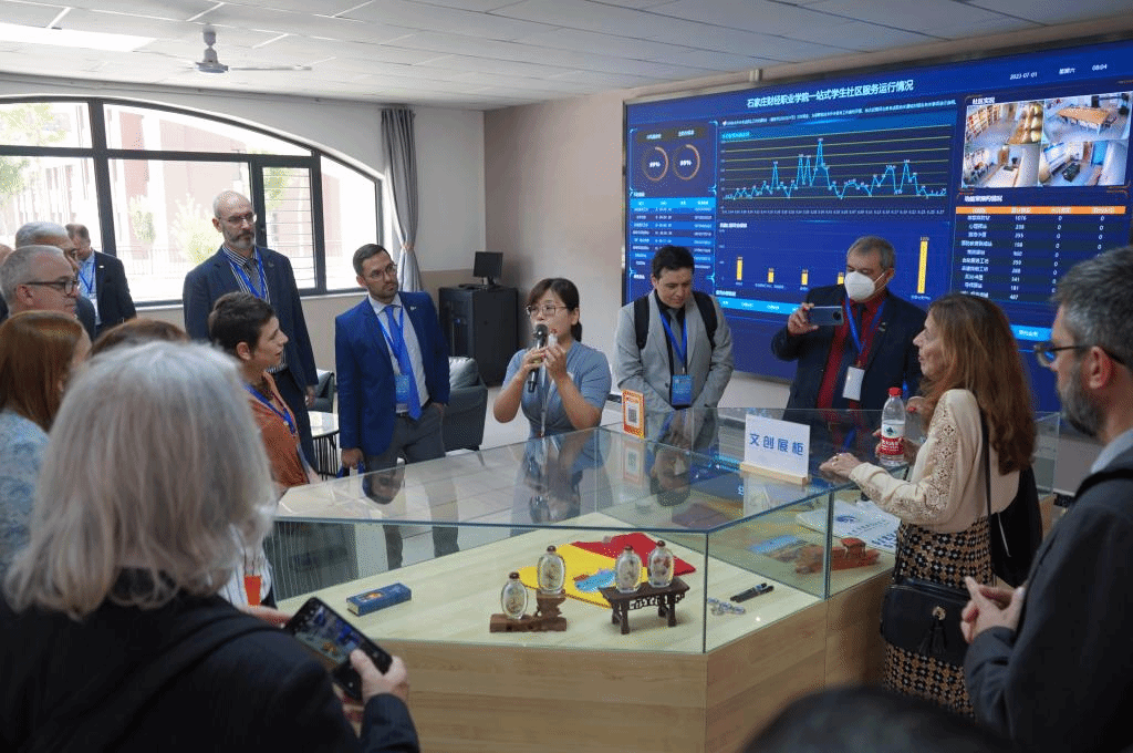 董事长肖瀚、校长赵建华、学校总监李文涛、党委副书记肖玉辉、副校长王永利、郑彦慧接待了巴西高校校长团,并陪同参观了学校各实训中心。学校各部门相关负责人为来宾讲解了各学院的发展建设情况以及教学、实训情况,并邀请来宾参与了实训模拟体验。随后,来宾参观了一站式学生服务大厅、教学运行中心和展室群。代表团成员对学校的发展成果、教学设施、国际化水平表示赞叹,并深入了解了河北省高职院校的发展情况。
