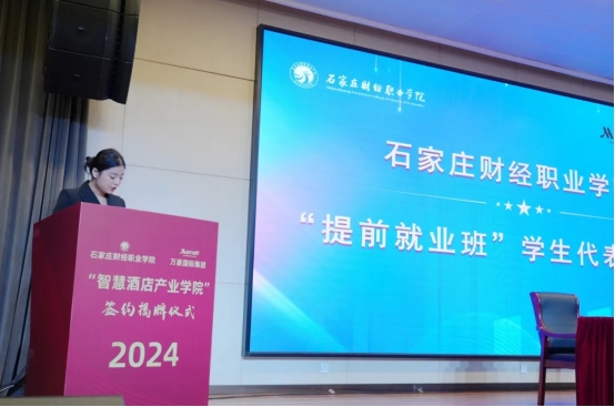 万豪国际集团中国北区副总裁韩璐梅女士致辞,她表示学校一直秉承“修德励志、强能善技”的校训,始终坚持内涵建设,特别在育人方面,坚持“以人为本、注重质量、突出特色、服务社会”的办学理念,与万豪国际集团“以人为本、拥抱变革、服务全球”的核心价值,以及关于年轻一代人才培养的构想不谋而合,她期待能以此次签约揭牌仪式为契机,加强校企双方紧密协作,共同培养出在未来行业持续变革与万豪国际集团深耕发展过程中,足以承担更多重任,也收获自身更多职业机遇的复合型专业人才。