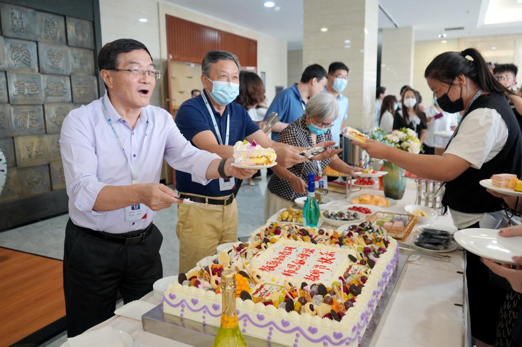 会后,校领导为学校教职工分发节日蛋糕和礼品。