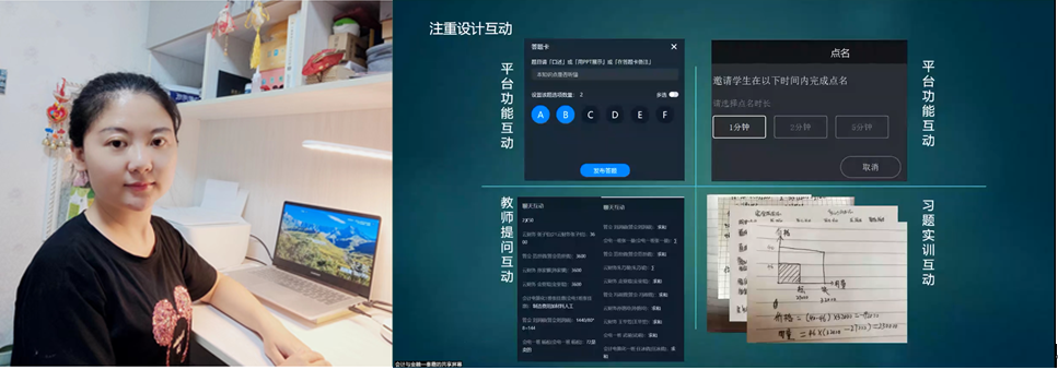 会计与金融学院的秦霜老师,从直播平台选用、外置配件、注重设计互动、巧用花式点评几个方面进行了分享。提出课堂点评要注重引导学生,通过考核激励学生提高线上教学参与度。