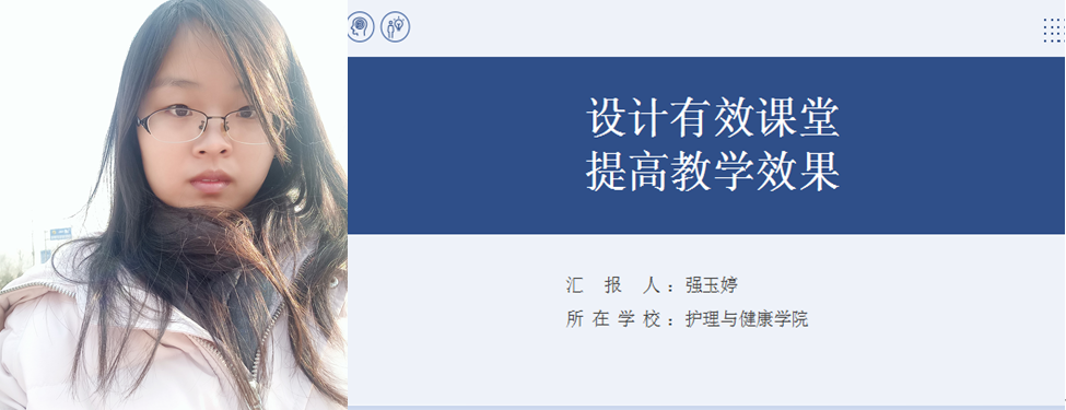 护理与健康学院的强玉婷老师,从设计有效课堂,提高教学效果进行了汇报。提出要优化课前准备,课中采取合适的教学方法,课后反思自己与学生的教与学,并设计有效的改进方案。