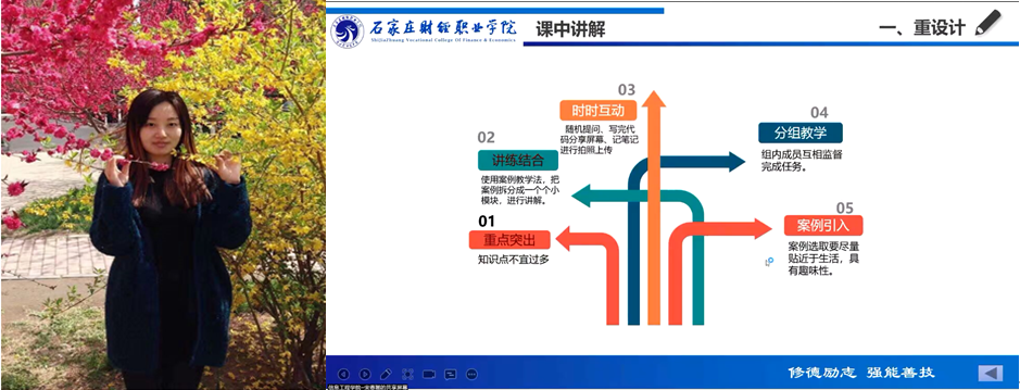 传媒学院的张雪娇老师,从如何使学生出镜、如何设计有效课堂、如何形成良好的学风几个方面进行汇报。提出可以通过大转盘点名的方式活跃课堂氛围,课中可以通过图文展示、游戏互动吸引学生,课后对学生作业严格管理,及时进行评价。