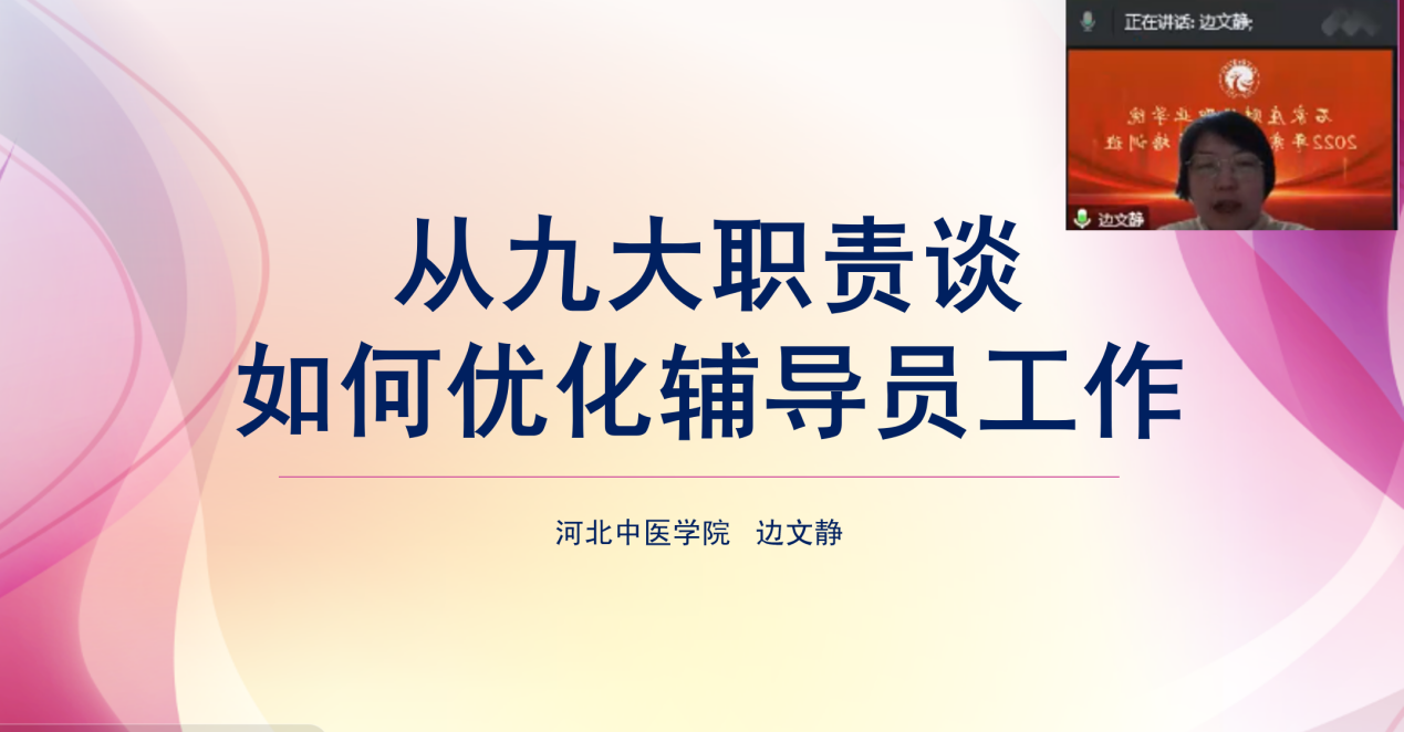 此次培训还特邀河北中医学院党政办公室副主任、全国中医药院校优秀学生工作者、优秀辅导员边文静,作《从九大职责谈如何优化辅导员工作》主题讲座。边老师结合多年一线辅导员工作实际,以鲜活生动的案例讲解了辅导员的“九大职责”;以生动活泼的语言分享辅导员如何履行好“九大职责”的工作方法。她提到辅导员要围绕学生、关照学生、关心学生,服务学生,同时还要努力提升自己,积极参加辅导员素质能力大赛,一分耕耘一分收获,脚踏实地实现从合格辅导员到优秀辅导员的华丽转变。