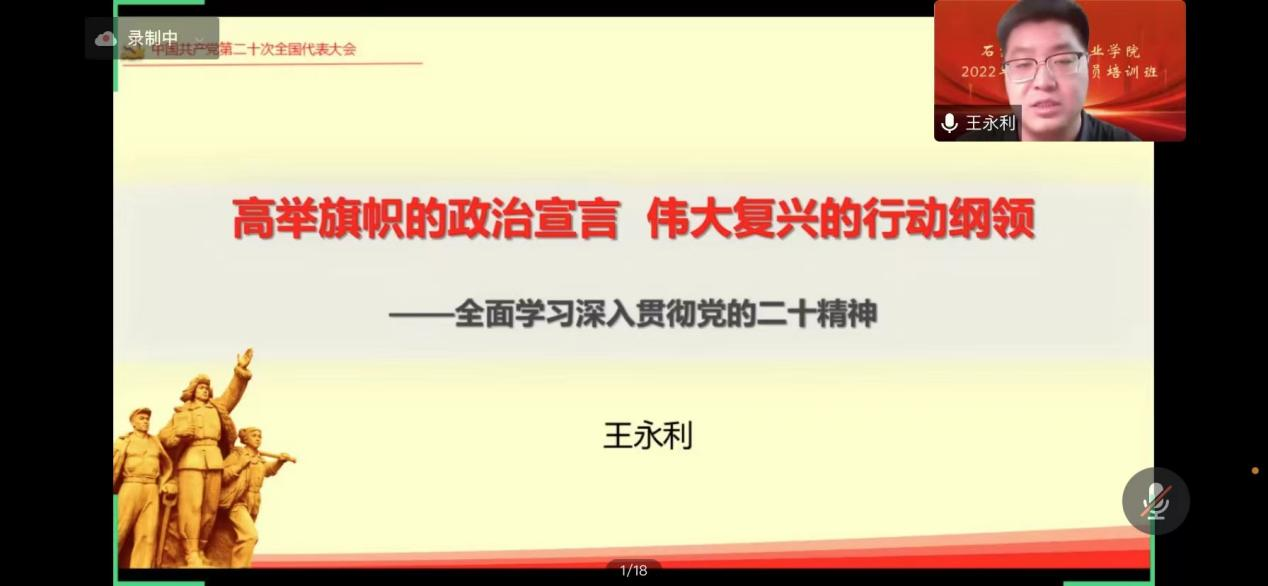 培训从校长助理王永利主讲的《高举旗帜的政治宣言伟大复兴的行动纲领——全面学习深入贯彻党的二十大精神》拉开帷幕。王助理从党的二十大主题及主要成果、关于过去五年的工作和新时代十年的伟大变革、关于马克思主义中国化时代化、关于中国式现代化、报告主要内容、报告中新时代职业教育、学院如何深学笃行、关于全面建设社会主义现代化国家的目标任务、关于坚持党的领导和全面从严治党、关于应对风险挑战等七个方面,紧密联系学校工作实际,对党的二十大精神进行了深入阐释和系统讲解。