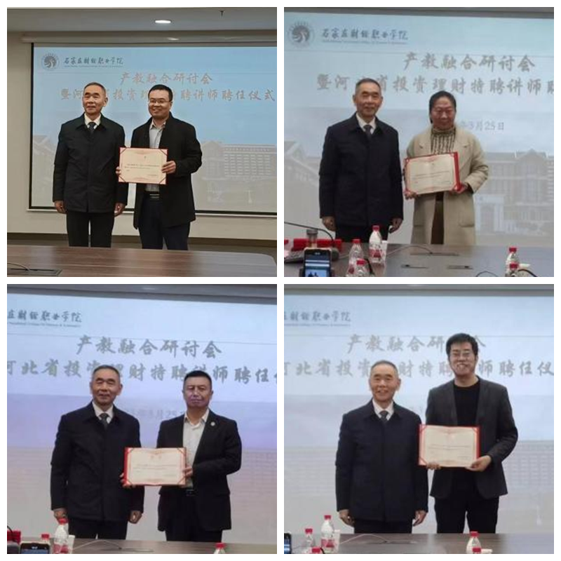 3月25日上午,由河北省企业投资理财协会主办、beat365承办的产教融合研讨会暨河北省投资理财特聘讲师聘任仪式在图书馆第一会议室举行。学校副校长郑彦慧、校企合作与就业处处长吴海军、投资理财协会会长崔立成和首批河北省企业投资理财协会聘任的23名讲师参加了会议。会议由河北省企业投资理财协会副会长张月珍主持。