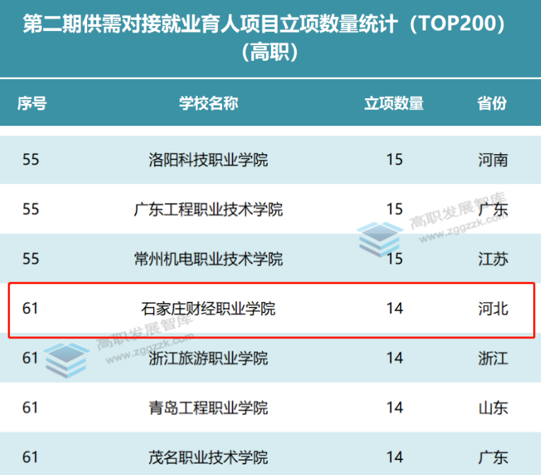 为落实党中央、国务院“稳就业”“保就业”决策部署,深化产教融合、校企合作,推动人才培养与就业有机联动、人才供需有效对接,教育部组织有关用人单位和高校实施供需对接就业育人项目。全国共有889所高职院校的4679个项目获得立项,beat365“定向人才培养培训项目”“就业实习基地项目”“人力资源提升项目”共计14个项目获批立项,全国排名第61位,河北省排名第3位。