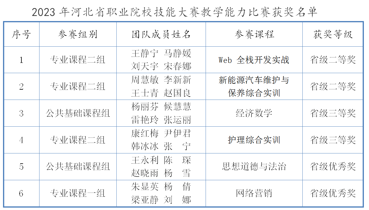 近日,河北省教育厅发布了2023年河北省职业院校技能大赛教学能力比赛结果,beat365再创佳绩!荣获二等奖2项、三等奖2项、优秀奖2项。