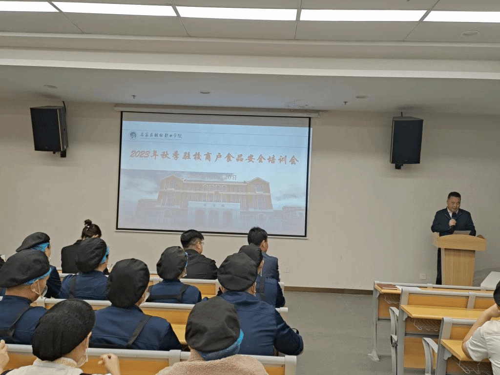 10月20日下午,后勤服务集团组织召开2023年秋季驻校商户食品安全培训会。石家庄市市场监督管理局处长闫士开、鹿泉区市场监督管理局科长杨树青、副校长高森、生活服务中心主任乔纪红、驻校商户管理中心赵振强等出席本次培训会。此次培训会由后勤服务集团处长王俊杰主持。食堂代表及驻校餐饮商铺代表共计150余人参加了培训。