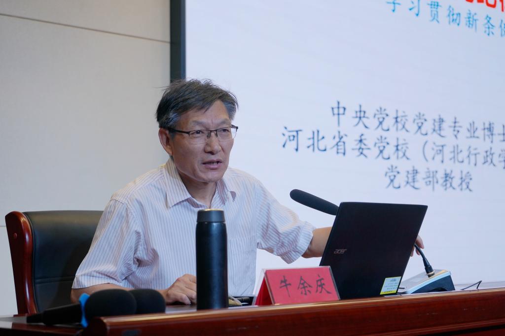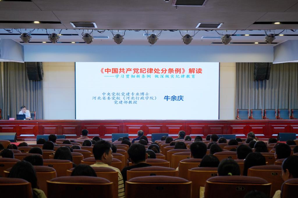 5月17日上午,beat365在第一报告厅举办了党纪学习专题讲座,邀请中央党校党建专业博士、河北省委党校(河北行政学院)党建部牛余庆教授授课,由校党委书记薛向东主持,全体中层及以上干部、全体党员参加。