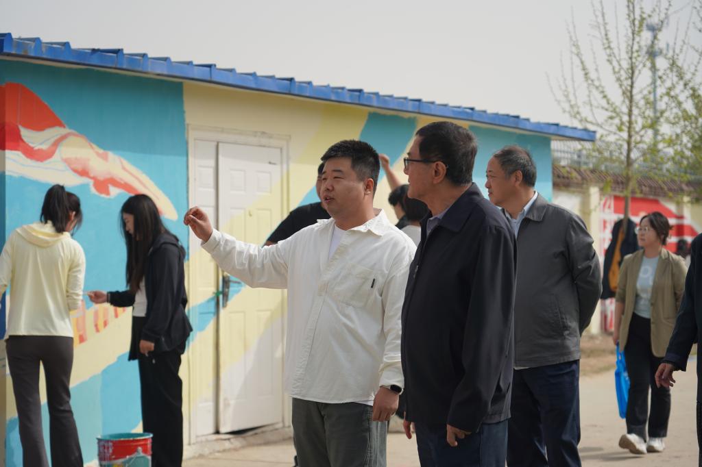 走出智慧培育实训室后,校领导前往操场,调研了正在推进的手绘墙项目。窦炳晨老师详细介绍了手绘墙的设计理念、绘画内容以及创作过程,展示了绘画过程中使用的专业画材、学生的绘画情况及实训进度。手绘墙项目作为学院参与校园文化建设的特色项目,每一期实施都融入了学院独特的艺术创意,充分展现了师生们对美的追求与诠释。