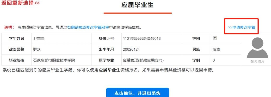 资格申请过程中,考生务必认真核对信息,如果考生姓名、身份证号、原学专业、照片等学籍信息有误,点击“申请修改学籍”,如图1所示。