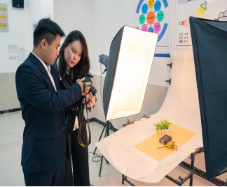 位于实训楼D306,占地面积131.04平方米,工位数50个,总投资8万余元。实训室由产品储藏区、小型商品摄影区和大中型商品摄影区构成,主要有平板电视教学一体机、摄影伞、摄影补光灯及小型摄影机等设备。实训室分区合理、布局规划科学、设备先进齐全极大满足了教学要求。密切结合职业岗位要求,可进行摄影棚布光实训,服装饰品类商品拍摄实训,美容护肤类商品拍摄实训,玻璃和金属制品类商品拍摄实训,数码家电类商品拍摄实训,photoshop处理图片实训,拍摄商品视频实训,剪辑制作视频实训等实训项目。