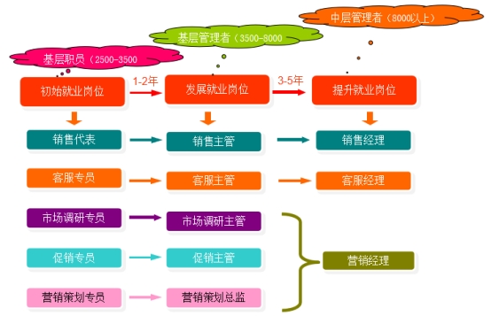 面向企事业单位,从事企业营销管理、市场营销策划、商品促销等岗位工作职业领域及主要就业岗位如下面图形所示: