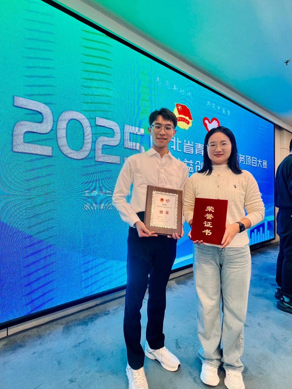 2025年10月16日,由共青团河北省委、省委社会工作部、省教育厅、省水利厅、省文化和旅游厅、省卫生健康委、省残联共同主办,河北省青年志愿者中心、河北省青年志愿者协会、共青团邯郸市委、共青团涉县县委承办的2025年河北省青年志愿服务项目大赛和公益创业赛决赛在邯郸市顺利举办。beat365学生葛航旗代表“夕阳红”智能助老服务团队在此次比赛中脱颖而出,斩获大赛银奖,为学校赢得荣誉。