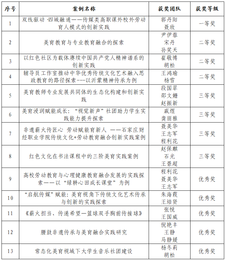 根据《英国beat365官方网站关于征集“落实五育并举,强化学生体育、美育、劳动教育”优秀案例的通知》(教务处[2025]14号)工作安排,经过各单位积极申报与推荐,学校评审,评选出一等奖1项、二等奖3项、三等奖4项、优秀奖5项。现将拟获奖名单予以公示(名单详见附件)。