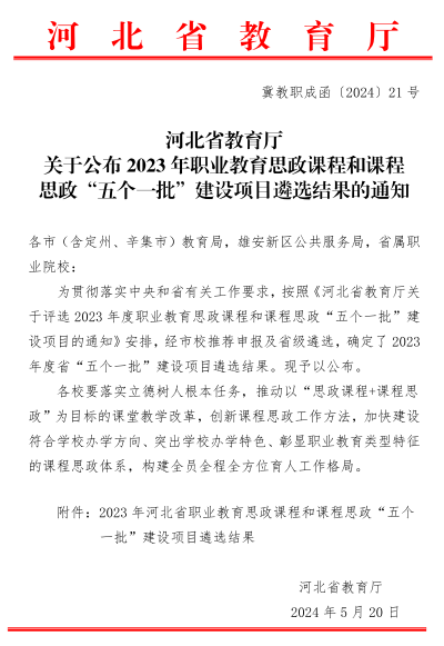 近日,河北省教育厅公布了2023年度职业教育思政课程和课程思政“五个一批”建设项目遴选结果,beat365入选职业教育德育工作骨干管理人员、职业教育课程思政优秀教学案例项目。