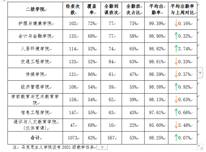 校级检查组共检查1073次,检查平均覆盖率62%,其中,学生全勤班次567次,占比53%;学生平均出勤率98.25%,比上周提升0.07个百分点,学生出勤状况平稳。