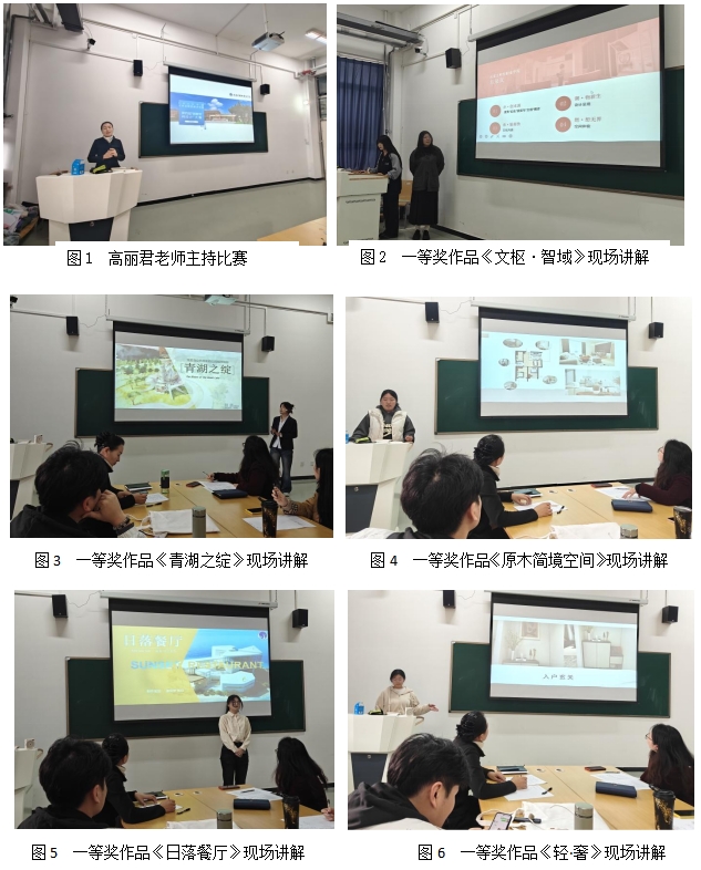 大赛自2025年10月21日起,正式启动班赛筛选环节,24级建筑室内设计专业、建筑动画技术专业、环境艺术设计专业学生以班级为单位组队参赛,每支团队由2-5名选手组成,在指导教师的协助下,围绕赛事主题展开创意构思与设计实践。选手们从手绘草图、主题装饰元素设计,到运用软件制图、PPT展示效果,全方位展现了扎实的专业基础与创新能力。经过严格筛选,一批优秀团队脱颖而出,11月5日,在学府校区善技楼106实训室正式开启校赛现场决赛。决赛现场氛围紧张而热烈,晋级团队按抽签顺序依次上台,通过PPT演示的形式,对作品进行详细讲解与答辩。选手们的设计作品紧扣主题,融入新设计理念、新材料与新工艺,呈现出当代生活新理念与时尚品质生活追求,充分展现了学生们的创新思维与专业素养。现场评委组由高丽君、王旭祺、窦炳晨等多位专业教师组成,他们严格依据赛事评分标准,从作品的创意性、专业性、完整性等维度进行客观公正的评审,最终当场决出一等奖5队、二等奖6队、三等奖9队。