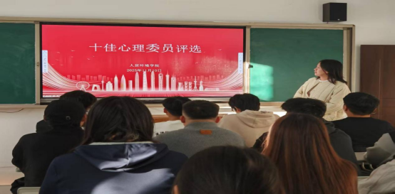 评选流程分为三个阶段:11 月1 日- 5 日为班级推荐阶段,由各班通过班会民主推荐候选人;11 月6 日- 8 日为材料审核阶段,学院心理健康中心对候选人的工作台账、活动方案、同学评价等材料进行综合审查;11 月10 日为现场评审阶段,候选人通过5 分钟工作汇报展示成果,评委团结合材料审核与现场表现打分,最终评选出10 名“十佳心理委员”并现场颁奖。