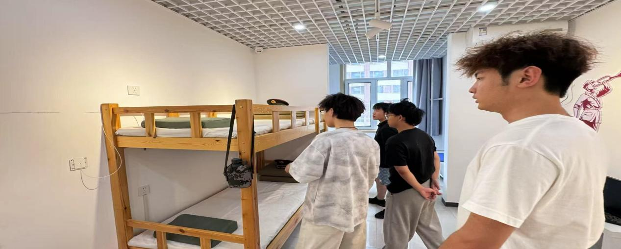 活动现场以 “模拟宿舍 + 国防知识展陈” 为载体:展室内还原了标准化军事化宿舍环境(如图中上下铺床位区域),墙面同步展示国防历史、军人作风等宣传内容。活动中,教官首先结合展室布置讲解了军事化内务的规范要求,随后现场演示 “豆腐块” 被子的折叠技巧 —— 从压被、抻角到修边,每一步都精准细致;学生们分组实操,在教官的指导下反复调整被子棱角、规范物品摆放,逐渐掌握了内务整理的核心要领。