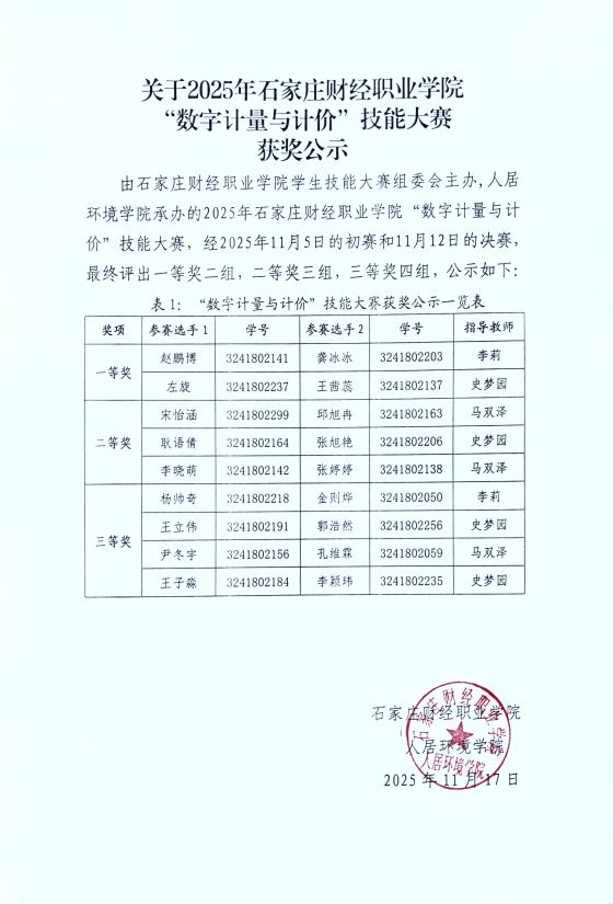 关于2025年英国beat365官方网站“数字计量与计价”技能大赛获奖公示