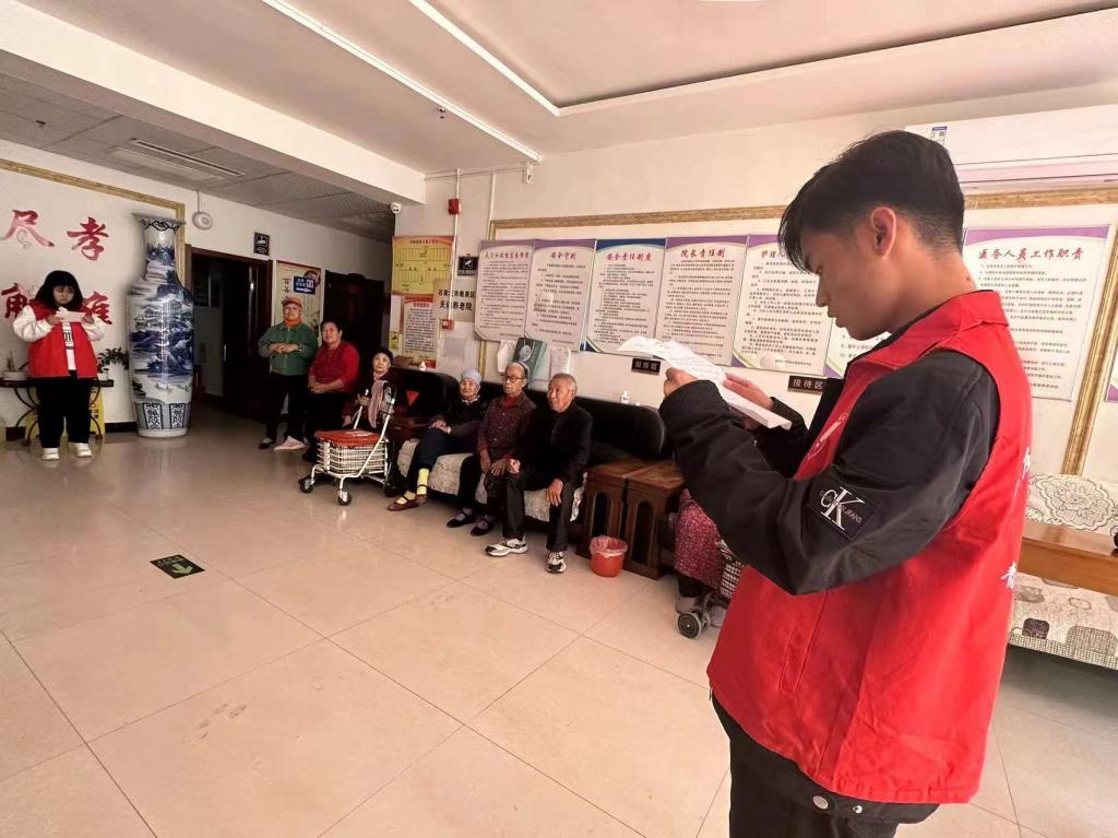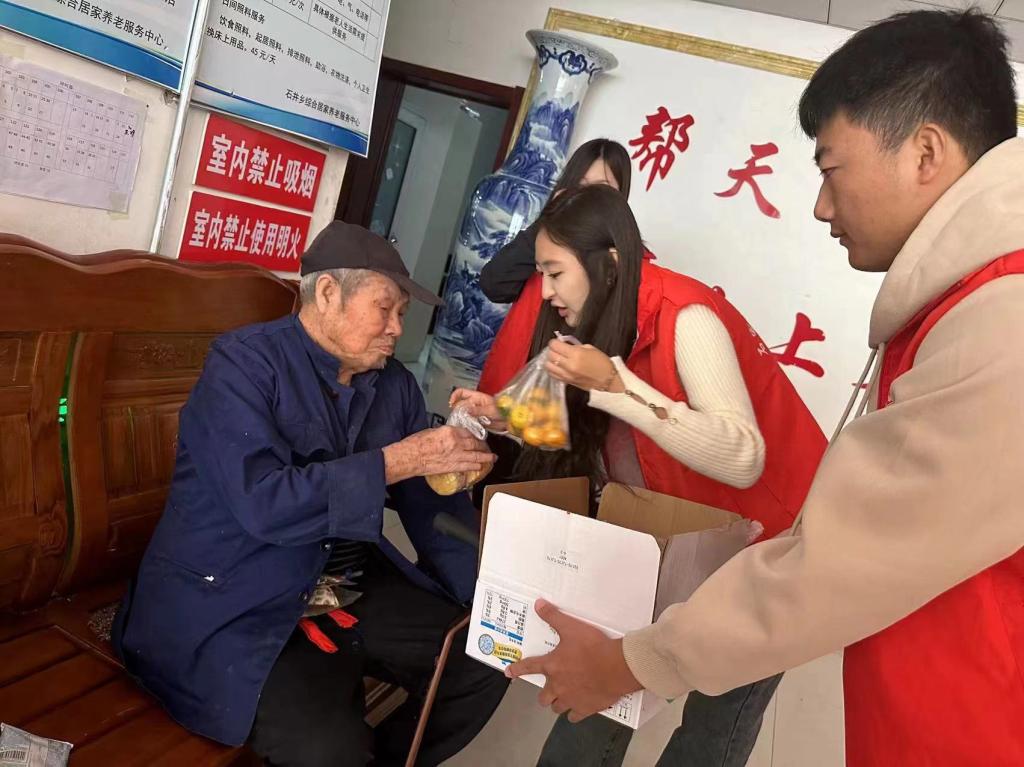 清晨九点,志愿者们怀着诚挚之心,带着慰问品来到石井乡敬老院,为老人们送上节日礼品和祝福。老人们热情欢迎同学们的到来,敬老院里充满了欢声笑语。志愿者们在敬老院开展义务劳动,为老人们打扫卫生、给老人读信、给老人们分发牛奶、面包、水果等礼品、陪老人们聊天。志愿者们和老人自由交谈的同时,将自己想对老人说的话写成了书信形式讲给老人听,并认真倾听老人们讲述改革开放前后的个人经历,使志愿者们了解今天的幸福来之不易。