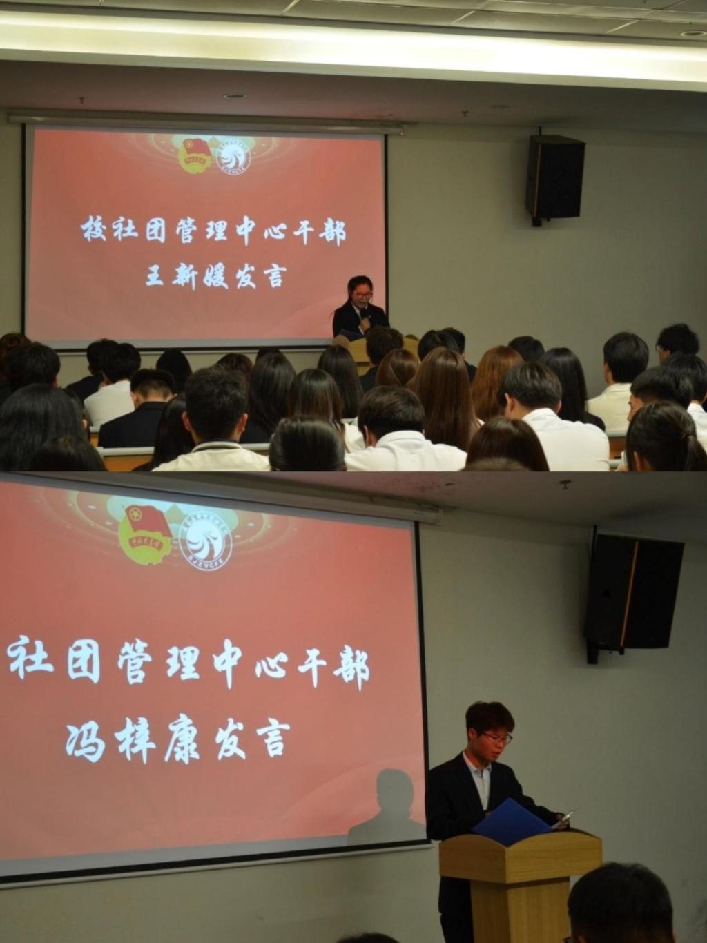 接着,社团管理中心副主任王新媛和冯梓康发表发言。他们阐述了自己对社团工作的理解与规划,承诺将以饱满的热情和认真负责的态度为社团服务,加强社团之间的交流与合作,共同推动学校社团事业的蓬勃发展。