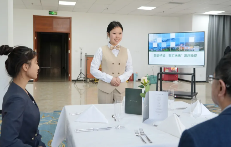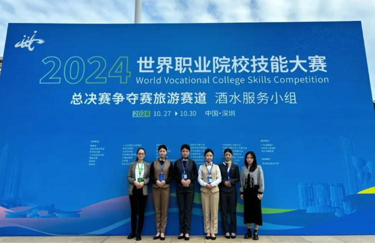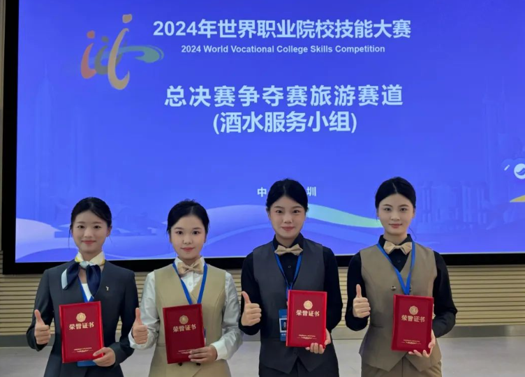 本次大赛由教育部主办,广东省教育厅倾心承办,深圳职业技术大学全力协办。其影响力如汹涌浪潮,吸引了来自全国的57支精锐之师竞相角逐。在这场激烈的技能盛宴中,经济管理学院的杨利、白晓兰两位导师,宛如智慧的灯塔,引领着王应霞、张欣芸、刘颖、贾世芳四名学子,无畏前行。他们深入钻研比赛规则,匠心独运地以 “醇香桥梁、智汇未来” 酒庄晚宴之形式,将调酒、侍酒与品鉴模块内容巧妙融合,犹如奏响一曲美妙的技能交响乐,让观众和评委们为之倾倒。