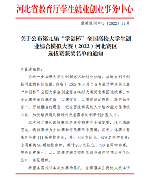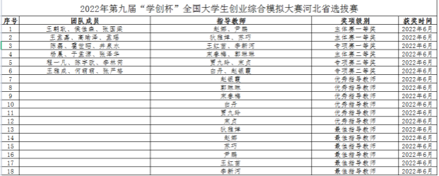 在刚刚公布的第九届“学创杯”全国大学生创业综合模拟大赛河北省选拔赛获奖名单中,beat365喜获多项奖项。